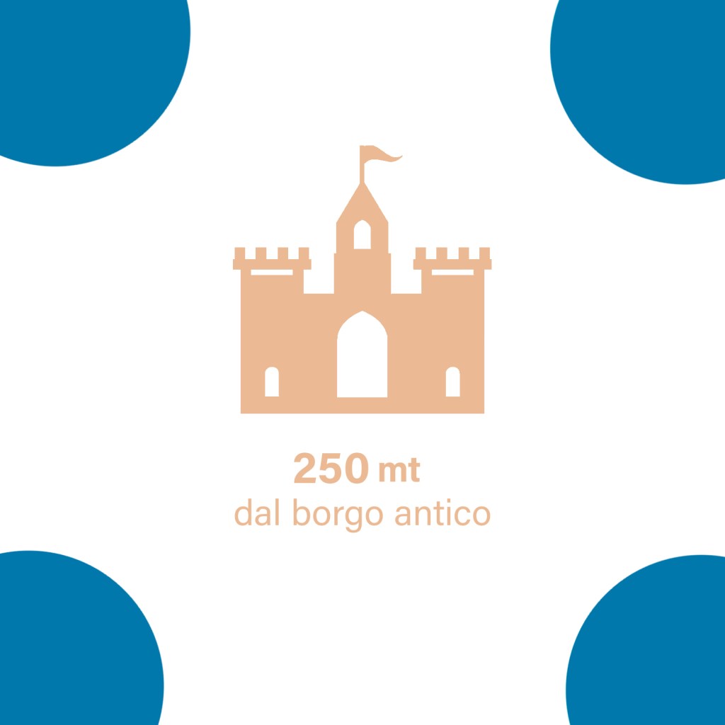 A soli 250 metri dal borgo antico, raggiungibile a piedi, in bici e in macchina.